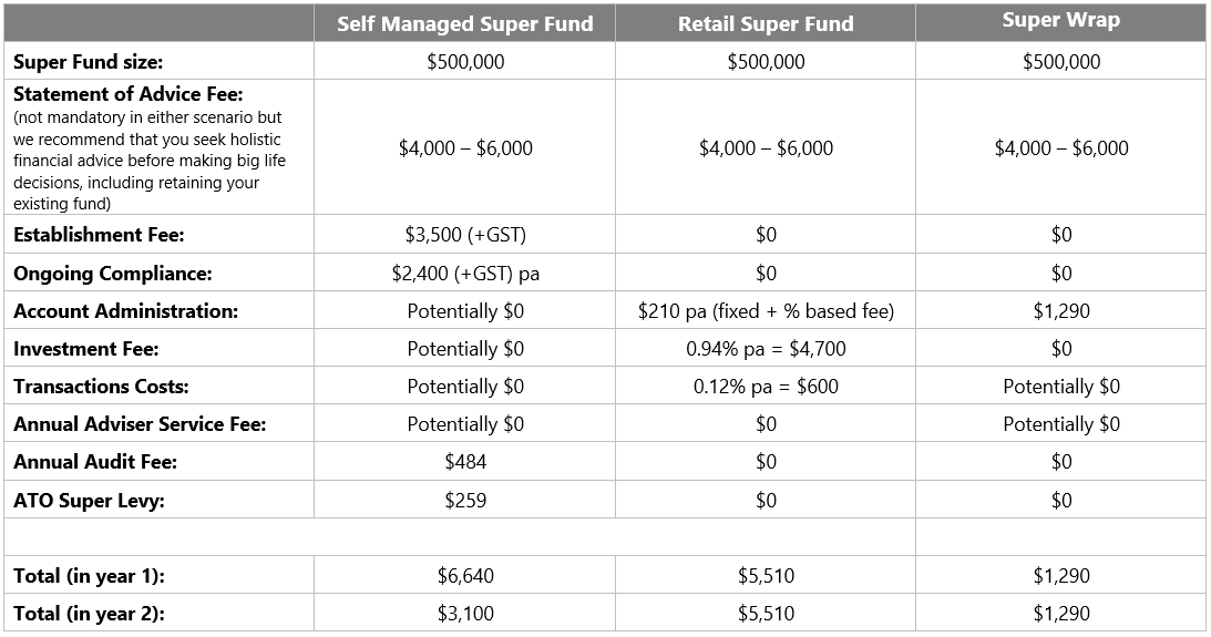 Note: The fees are similar for setup and the first year, though the longer-term is where an SMSF may be more cost-effective than standard retail funds.