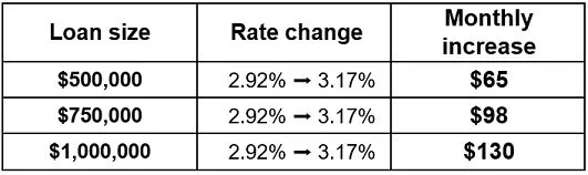 Based on an owner-occupier paying principal and interest with 25 years remaining on the average variable rate of 2.92% assuming the banks pass the cash rate hike on in full.